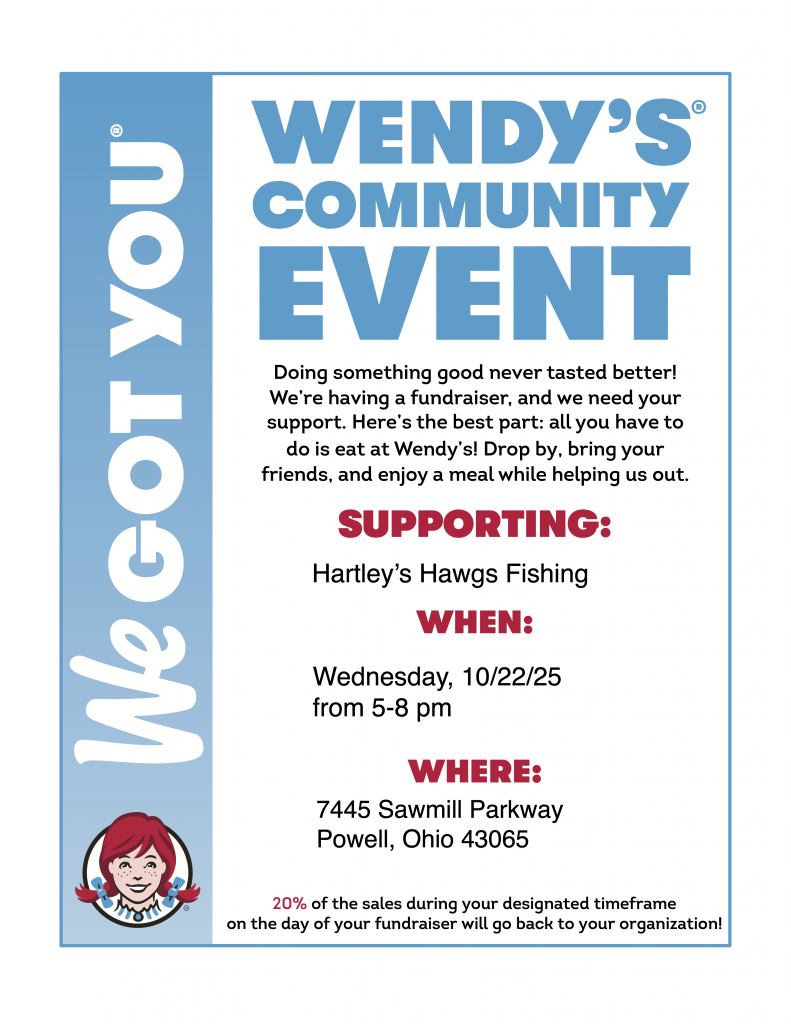 Stop at Wendy’s on Sawmill Parkway in Powell between 5-8p and pickup some dinner. 20% of sales goes toward the club. See below for a flyer. Share this with friends and family and eat out for a great cause.